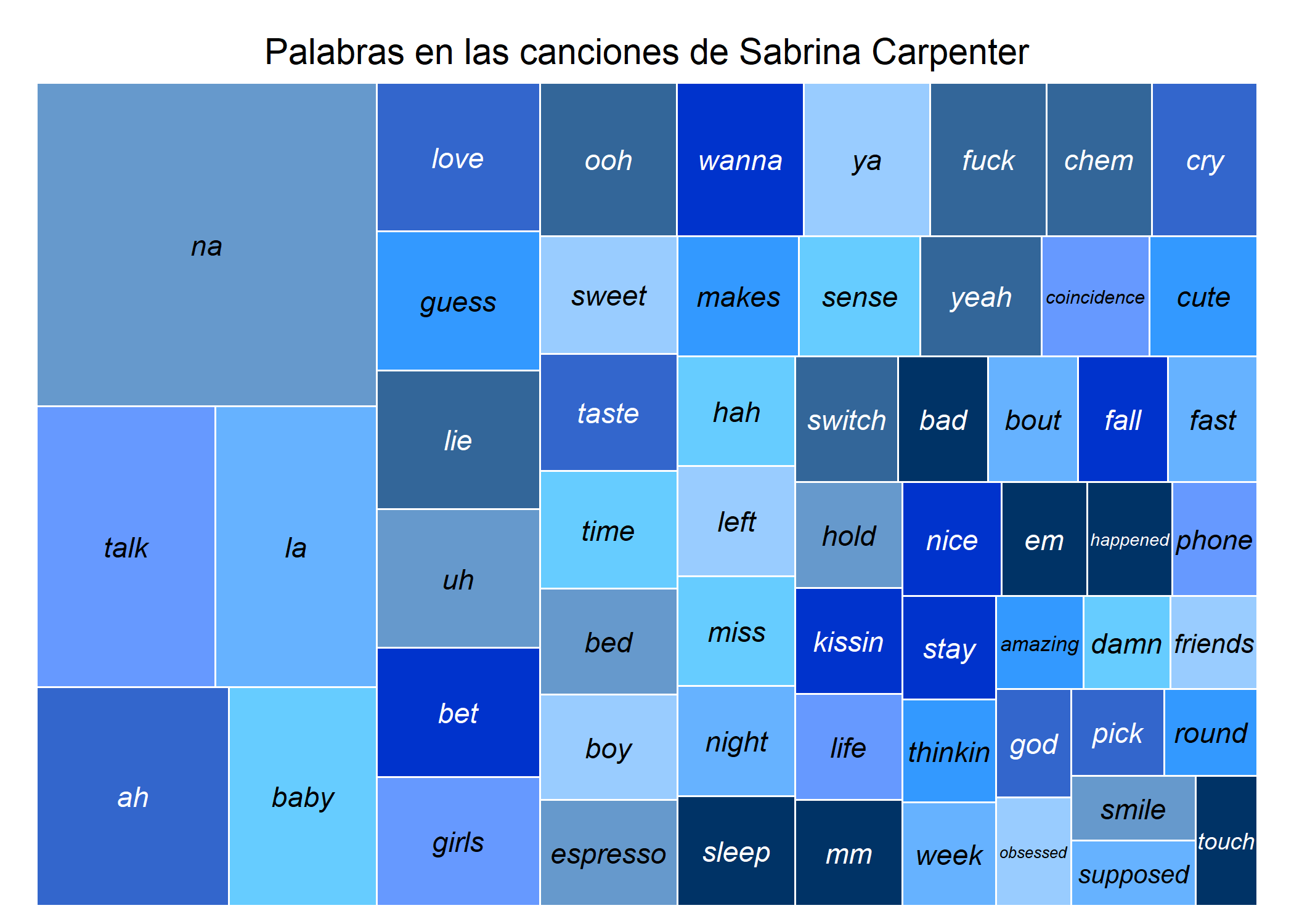 El treemap visualiza las palabras más usadas en las letras de Sabrina Carpenter, donde su tamaño refleja la frecuencia. Muestra un léxico centrado en el amor, la sensualidad ("bed", "fuck"), la autoconfianza ("yeah", "wanna") y la reflexión emocional ("guess", "lie", "talk").
